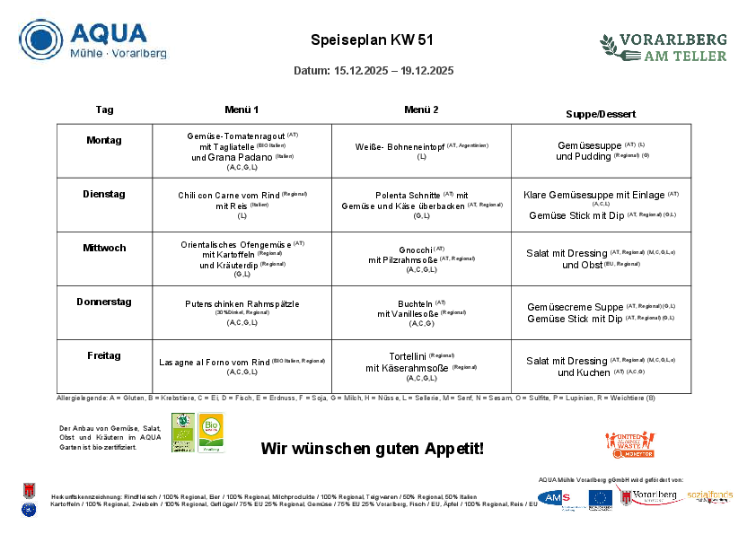 Menüplan | KW 51 | 15. - 19. Dezember 2025